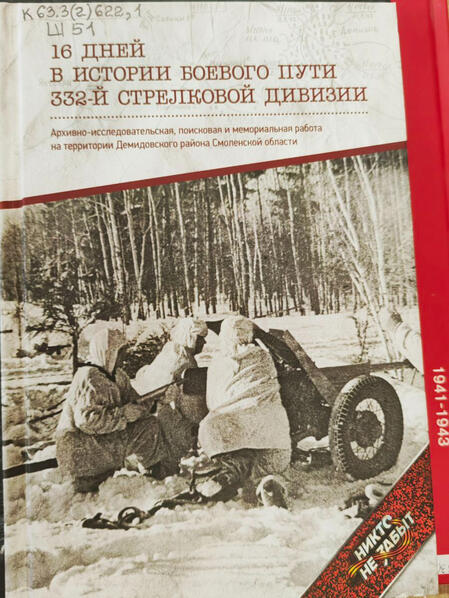 16 дней в истории боевого пути 332-й стрелковой дивизии = Шестнадцать дней в истории боевого пути 332-й стрелковой дивизии / Смоленская областная общественная организация "Поисковое объединение "Долг" / автор-составитель А.В. Корнеев. — Демидов, Смоленская область, Смоленск : [б. и.] ; Остров свободы, 2016. — 304 с.