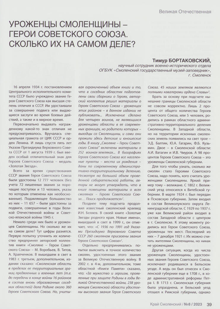 Бортаковский Т. Уроженцы смоленщины — герои Советского Союза. Сколько их на самом деле? / Т. Бортаковский // Край Смоленский.- 2023. - № 8. - С. 39-40.